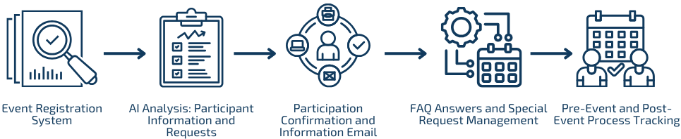 AI Event Coordinator centrally and completely autonomously manages all communication and organizational processes before, during, and after the event. It sends automatic, timely email notifications to attendees, collects attendance confirmations, and records special requests (e.g., dietary preferences, seating arrangements, accessibility requirements).