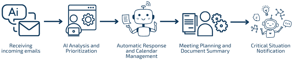 AI Executive Assistant is an intelligent assistant designed to minimize the intense communication and planning burden in your business life. It analyzes your incoming email traffic in real time and prioritizes it based on its content and importance. It saves you valuable time by autonomously handling frequently used or routine correspondence.