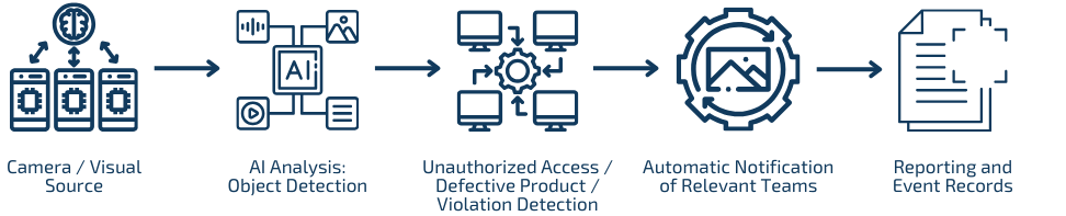 Furthermore, the system analyzes past records to predict future risk scenarios and help implement preventative measures. It ensures that quality standards are maintained in production processes and that access and behavior protocols are fully implemented in security areas.